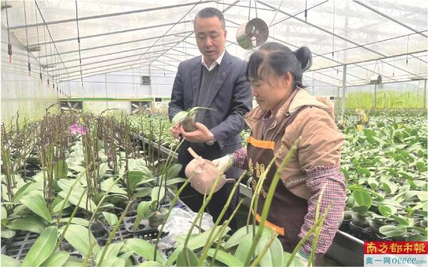 顺德中行客户司理与农户一起巡逻兰花滋长情况。