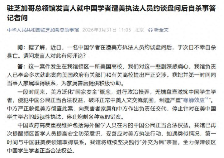 3月30日,据中国驻芝加哥总领馆官微:驻芝加哥总领馆发言东谈主就中国粹者遭好意思礼貌东谈主员约谈酌量后自尽事答记者问。 问:据了解,近日,又名中国粹者在遭好意思方礼貌东谈主员约谈酌量后,于次日祸害自尽身一火。讨教发言东谈主对此有何批驳? 答:这一案件发生在我馆领区一所好意思国高校,咱们对这一悲催深感难受。我馆厚爱东谈主已降服屡次就此案向好意思国政府相干部门和相干高校提倡严正交涉。我馆并第一工夫同当事东谈主家属获得筹商,为家属善后提供积极协助。 一段工夫来,好意思方泛化“国度安全”观点,进行政事操弄,无端盘查滋扰中国粹生学者,金宝博骚动中国公民正直正当职权,阻碍浮浅中好意思东谈主文考虑氛围,制造严重“寒蝉效应”。中方严正敦促好意思方彻查此案,向受害者家属和中方作出负连累移交,罢手针对在好意思中国粹生学者的敌视性礼貌,罢手炮制多样冤假错案。 中国政府高度喜爱珍爱包括外洋留学东谈主员在内的中国公民正直正当职权。我馆已再次指示领区留学东谈主员提升安全闪耀意志,妥善搪塞好意思方礼貌当作,如遇近似情况,第一工夫与中国驻好意思使领馆获得筹商。我馆将陆续刚硬践行“酬酢为民”办法,全力保险领区中国粹生学者正直正当职权