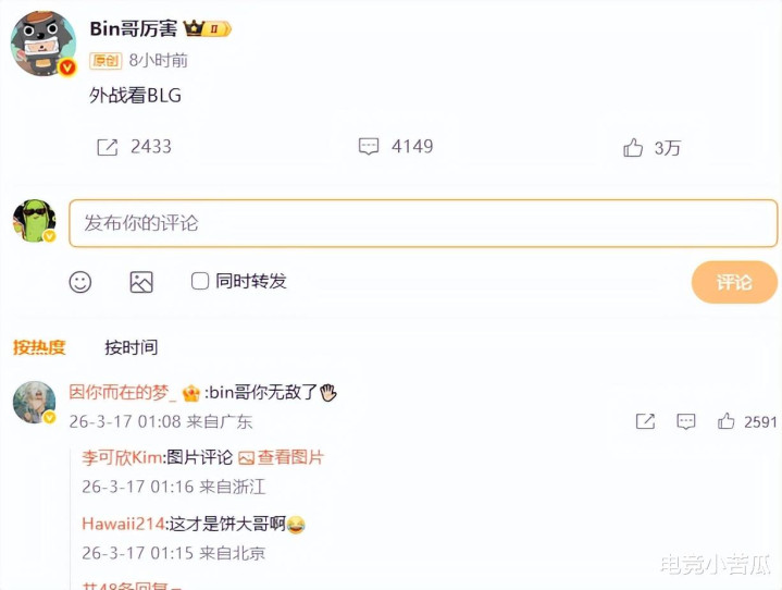 赛后Bin年老也很秀,径直一句外战看BLG,很自信。确乎如斯,BLG等于LCK战队的克星,络续冲刺吧。