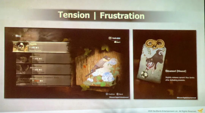其次,是资源经管倒逼计谋:敌东谈主不会掉落资源,击杀反而会耗尽谈具,这从根源上饱读舞玩家衡量“战”与“避”,并借此看护病笃感。 咱们还构建了一套等效的资源系统:人命值、膂力值、沉默值,可购买的“御守”护身符。