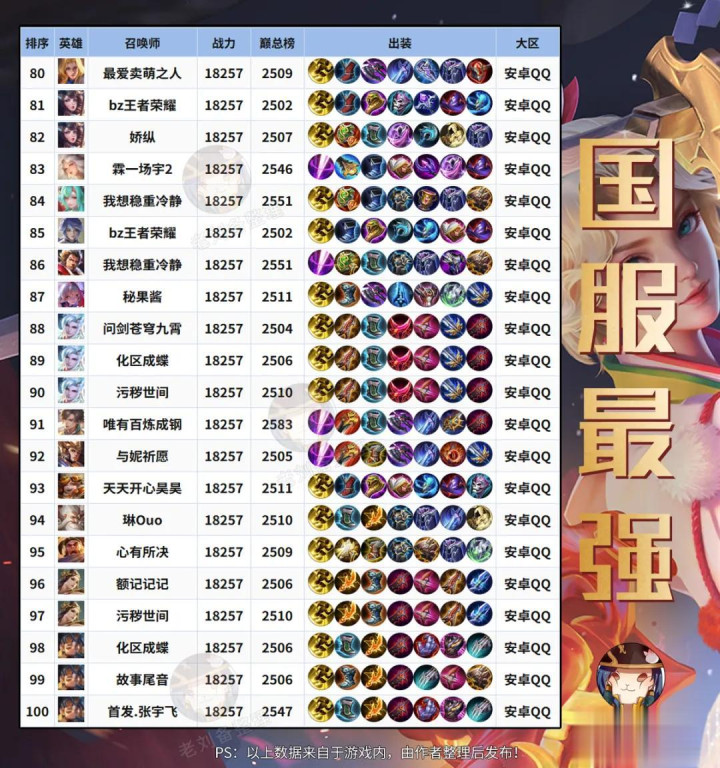 云缨 咱们再来看下前100的数据,本期榜首是由云缨取得,最高战力冲破到了20575,是本期唯二冲破到2W战的枭雄,可谓相称恐怖。 PS:镜亦然换取分数,皆出自于脱色位玩家。 目下的云缨,不仅是全分段当中热点,金佰利尖端局、工作赛场上也常常能看到她的身影。 主要照旧此前加强关联,让云缨的短板被缓解了许多,如今又肉又有伤害,亦然现版块独一能与镜抗衡的枭雄了。