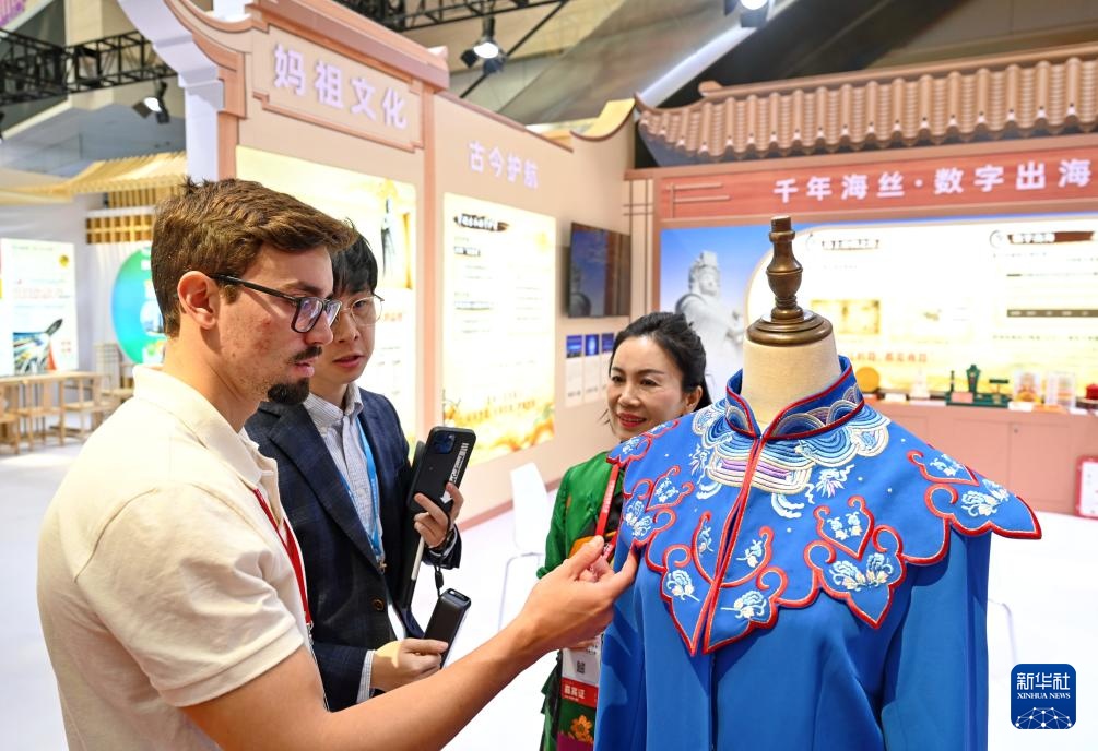 3月18日,巴教师客(左一)在妈祖文化主题专区了解特质衣饰。新华社记者 林善传 摄
