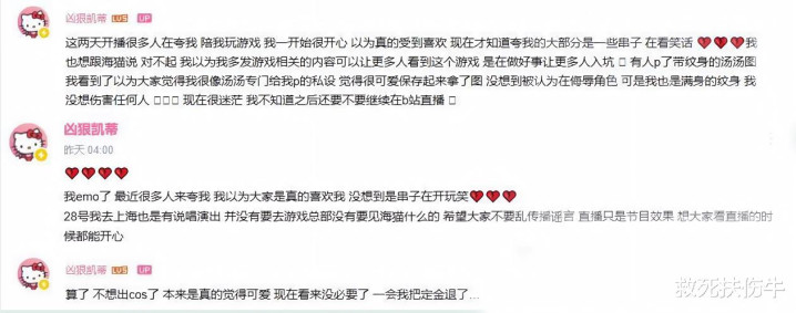 在察觉特殊后,恣虐凯蒂的复兴。 据其自述,简略等于看到直播间东说念主气高涨、弹幕互动强烈时,以为我方的现实终于被全球招供,“以为真实受到了心爱”。 出于这种“被摄取”的错觉,她驱动更积极地围绕最后地创作现实,包括筹办cos游戏变装“伊冯”、为其翻唱我方的作品等。她暗意,其时的思法是“多发游戏关系的现实,能让更多东说念主看到这个游戏”,认为这是在给鹰角“作念善事”。 看到有网友P了一张带有纹身的汤汤鬼图,还以为是粉丝为她设想的“私设”,认为“很可人”便保存下来。我方自己也有纹身,因此并未察觉这张图带有抨击性,还会被解读为“侮辱变装”。没思过伤害任何东说念主。 当今意志到被“串”,知说念“夸我的大部分是一些串子,在看见笑”后,这一贯通让她堕入困惑与自责。晓喻烧毁伊冯cos筹办:“原来是真实认为阿谁变装很可人,当今看来没必要了。”并明确暗意已退还定金。