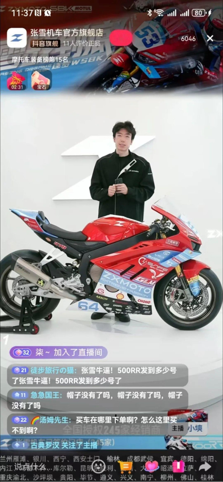 另据极目新闻,跟着中国品牌摩托车在国外赛场创造历史,金佰利张雪机车谈论量大增,数千东说念主涌入官方直播间,多款邻近适度商品售罄。记者还了解到,现在820RR暂未通达试驾。 30日上昼,在短视频平台,张雪机车各地门店直播间皆有浩繁网友涌入,“张雪机车官方旗舰店”直播间涌进超6000东说念主。网友皆在怜惜价钱、拉花、马力、试驾、邻近居品等信息。关于门店售卖的车是否即是这次比赛赛说念上的车,主播示意分别不大。据张雪也曾在我方的视频中呈报,上赛场的820RR在主要部件发动机、刹车盘、减震、卡钳、轮毂等跟量产版相易,仅仅在排气、水冷、容颜等按赛事条件进行改装。 另有张雪机车官方直播间主播示意,820RR轨范版照旧是“双冠车型”,现在照旧有下定的820RR驱动发货,车辆录用周期在4周傍边。